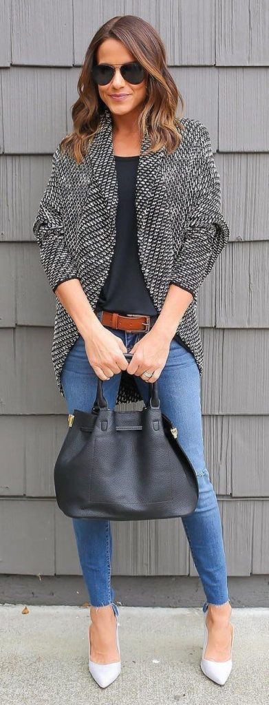 1. Jeśli sweterek rozpinany i dzianinowy, to zdecydowanie niestandardowy (może być oversizowy albo z fantazyjnym zapięciem). Charakter stylizacji będzie w każdym razie lużny, jednak ciekawy.